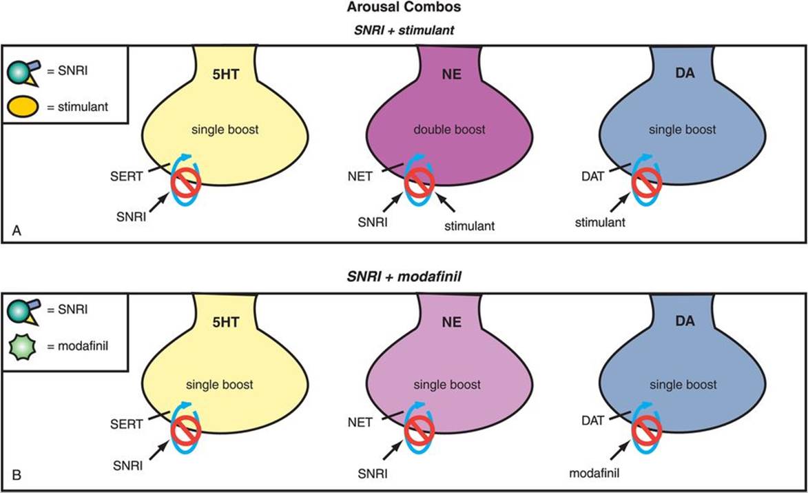 Figure 7-88. Heroic combos, part 3: SNRI plus stimulant or modafinil. A serotonin–norepinephrine reuptake inhibitor (SNRI) plus a stimulant means that serotonin (5HT) and dopamine (DA) are single-boosted and norepinephrine (NE) is double-boosted. With an SNRI in combination with modafinil, serotonin (5HT) and norepinephrine (NE) are single-boosted by the SNRI while dopamine (DA) is single-boosted by modafinil.