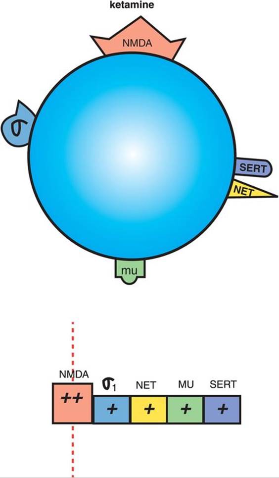 Figure 7-90. Ketamine. Ketamine is being studied for its potential therapeutic utility in depression. Ketamine is an NMDA (N-methyl-D-aspartate) receptor antagonist, with additional weak actions at σ1receptors, the norepinephrine transporter (NET), µ-opioid receptors, and the serotonin transporter (SERT).