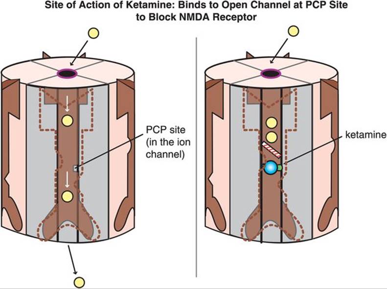 Figure 7-91. Site of action of ketamine. Ketamine binds to the open channel conformation of the N-methyl-D-aspartate (NMDA) receptor. Specifically, it binds to a site within the calcium channel of this receptor, which is often termed the PCP site because it is also where phencyclidine (PCP) binds. Blockade of NMDA receptors may prevent the excitatory actions of glutamate, which is postulated to be a therapeutic mechanism for treating depression. In fact, ketamine has demonstrated rapid, short-term antidepressant effects in both animal models and in humans.