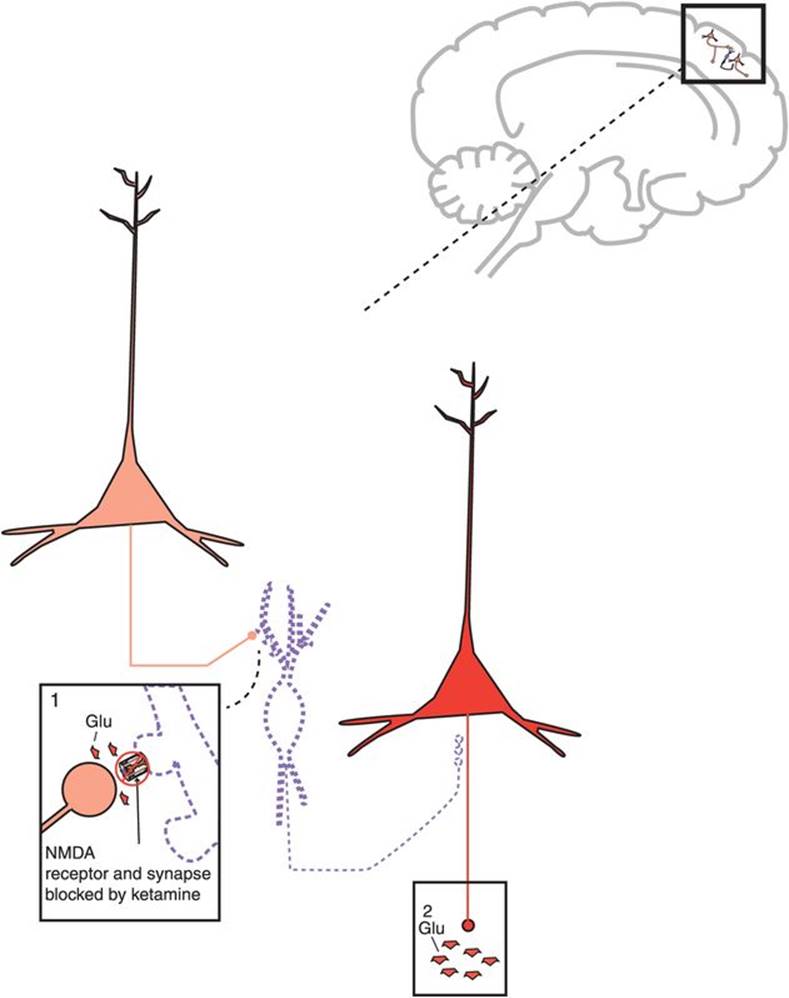 Figure 7-92. Mechanism of action of ketamine. Shown here are two cortical glutamatergic pyramidal neurons and a GABAergic interneuron. (1) If an N-methyl-D-aspartate (NMDA) receptor on a GABAergic interneuron is blocked by ketamine, this prevents the excitatory actions of glutamate (Glu) there. Thus, the GABA neuron is inactivated and does not release GABA (indicated by the dotted outline of the neuron). (2) GABA binding at the second cortical glutamatergic pyramidal neuron normally inhibits glutamate release: thus, the absence of GABA there means that the neuron is disinhibited and glutamate release is increased.