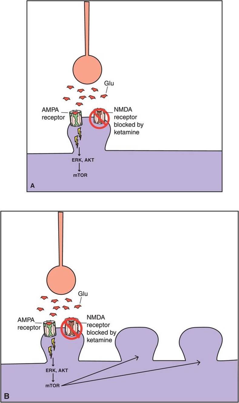 Figure 7-93. Ketamine, AMPA receptors, and mTOR. Glutamate activity heavily modulates synaptic potentiation; this is specifically modulated through NMDA (N-methyl-D-aspartate) and AMPA (α-amino-3-hydroxy-5-methyl-4-isoxazole-propionic acid) receptors. Ketamine is an NMDA receptor antagonist; however, its rapid antidepressant effects may also be related to indirect effects on AMPA receptor signaling and the mammalian target of rapamycin (mTOR) pathway. (A) It may be that blockade of the NMDA receptor leads to rapid activation of AMPA and mTOR signaling pathways. (B) This in turn would lead to rapid AMPA-mediated synaptic potentiation. Traditional antidepressants also cause synaptic potentiation; however, they do so via downstream changes in intracellular signaling. This may therefore explain the difference in onset of antidepressant action between ketamine and traditional antidepressants.