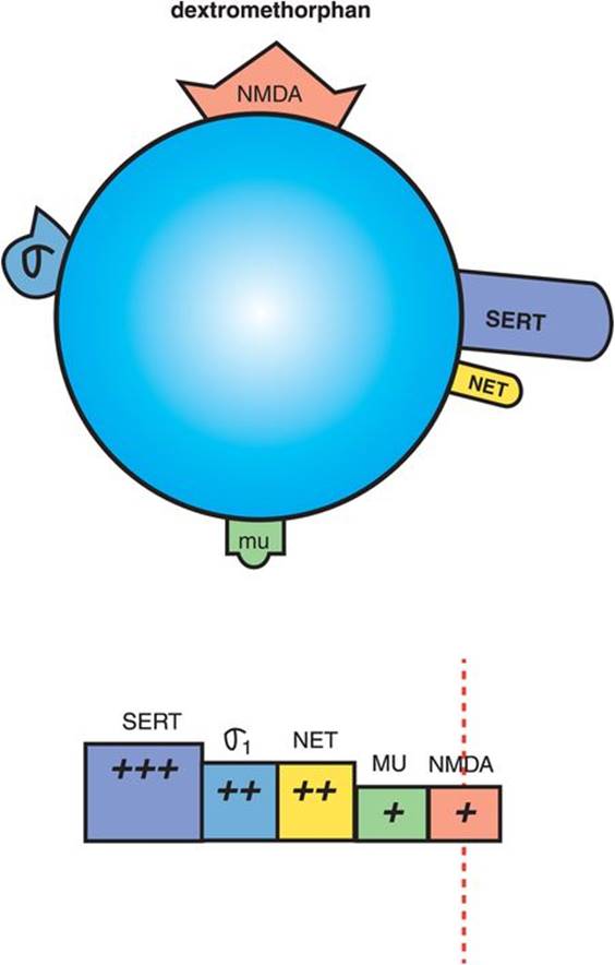 Thus, investigators are looking for other agents that can trigger the pharmacologic changes that ketamine induces, from blocking NMDA receptors, to stimulating AMPA and various mGlu receptors, to inducing the mTOR pathway and an increase in dendritic spines. One candidate for an “oral ketamine” that acts on NMDA receptors is the cough medicine dextromethorphan (Figure 7-94). Both ketamine and dextromethorphan share actions not only at NMDA receptors, but also at σ receptors, µ-opioid receptors, SERT, and NET, but with different affinities (compare Figures 7-90 and 7-94). Dextromethorphan combined with quinidine (to prevent its metabolism to dextrorphan, which does not penetrate the brain effectively) is available in the US to treat unstable affect known as pseudobulbar affect, and could theoretically act in other disorders of mood and affect – but much more clinical testing is necessary. Many other agents that act on NMDA receptors as potential rapid-acting ketamine-like antidepressants are in early-stage clinical trials.