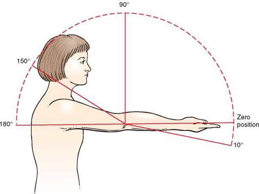 In the evaluation of a joint, assess the range of motion. Each joint has a characteristic range of motion that can be measured passively and actively. Passive range of motion is the motion elicited when the examiner moves the patient's body. Active range of motion is the motion the patient performs as a result of moving the musculature. The passive range of motion usually equals the active range of motion except in cases of paralyzed muscles or ruptured tendons. The range of motion of individual joints is discussed later in this chapter. Joint motion is measured in degrees of a circle, with the joint at the center. If a limb is extended with the bones in a straight line, the joint is at zero position. The zero position is the neutral position of the joint. As the joint is flexed, the angle increases. The concept of range of motion is illustrated in Figure 20-4.