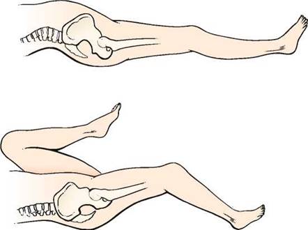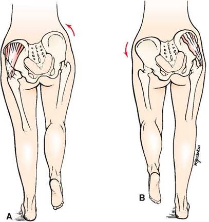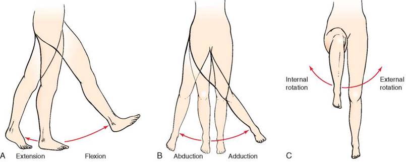 The anatomy of the hip is illustrated in Figure 20-13. The joint movements at the hip are flexion and extension, abduction and adduction, and internal and external rotation. These motions are illustrated in Figure 20-14.