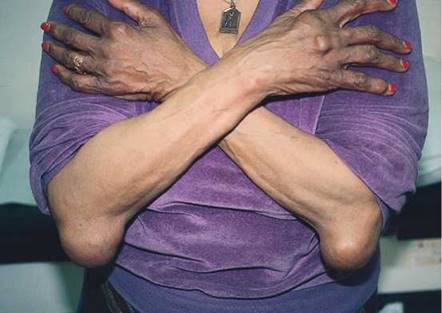 • There is marked ulnar deviation of both hands in association with a flexion deformity of all the proximal interphalangeal joints and hyperextension of all the distal interphalangeal joints. Marked tenderness of both wrists is present.