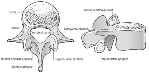 Figure 10.1 A lumbar vertebra, seen from superior and lateral aspects. Reproduced with permission from Yentis SM, Hirsch NP, Smith GB. Anaesthesia and Intensive Care A-Z, 4th edn. Churchill Livingstone. © Elsevier 2009.