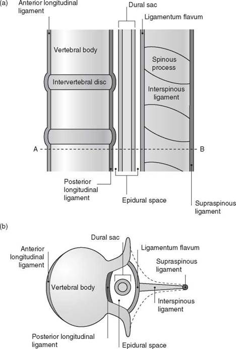 Figure 10.3 Vertebralligaments: (a) longitudinal section and (b) transverse section through A-B. Reproduced with permission from Yentis SM, Hirsch NP, Smith GB. Anaesthesia and Intensive Care A-Z, 4th edn. ChurchillLivingstone. © Elsevier 2009.