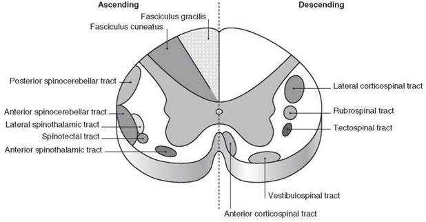 Figure 10.4 Ascending and descending tracts of the spinalcord. Reproduced with permission from Yentis SM, Hirsch NP, Smith GB. Anaesthesia and Intensive Care A-Z, 4th edn. ChurchillLivingstone. © Elsevier 2009.