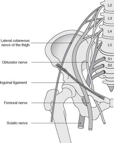 The lumbar and sacral plexuses are shown schematically in Figure 10.5. They form at the posterior of the pelvis, and their branches pass round the interior of the pelvis, where they may be exposed to pressure during labour and delivery (Figure 10.6; see also Chapter 53, Peripheral nerve lesions following regional anaesthesia).