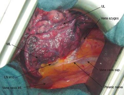 Figure 11.3 Mediastinal pleura incised exposing partially dissected upper pulmonary vein and arteries to middle and lower lobe as well as lymph nodes.