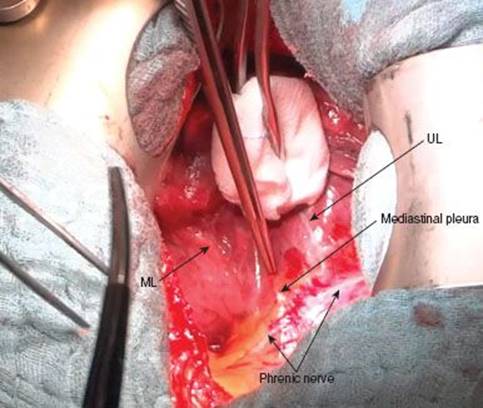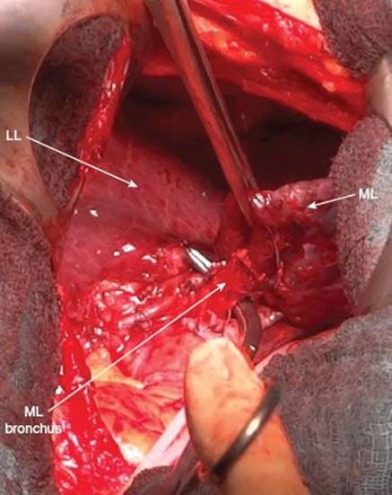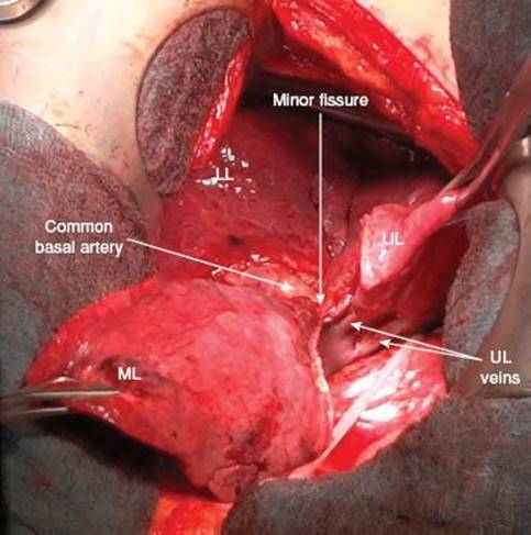 The following description will be detailed for the open approach but it is basically true for the thoracoscopic approach as well. When performing the procedure by VATS one should have a low threshold to convert to the open technique in cases of impaired visualization or complications. Because the vessels to the middle lobe come from the interlobar artery and drain into the upper pulmonary vein respectively, insufficient visualization may lead to accidental transection or disrupture of vessels of the upper or lower lobe. This would result in additional lobectomy, in the worst case even in right-sided pneumonectomy.