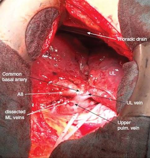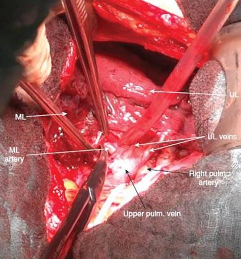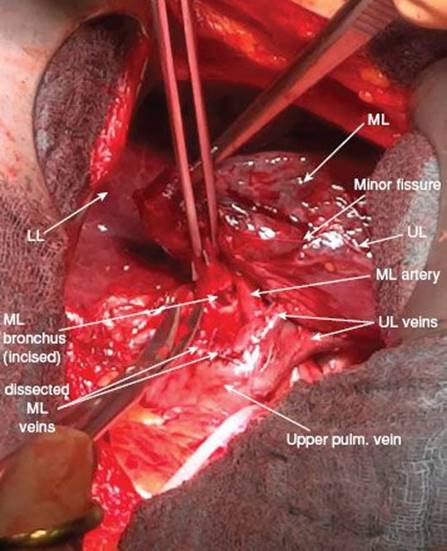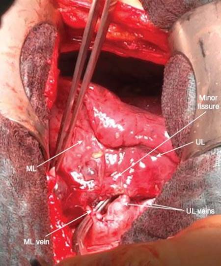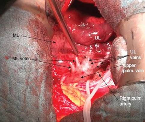 The range of anatomical variations includes venous drainage into the lower pulmonary vein or even the combination of one middle lobe vein draining into the upper and one draining into the lower pulmonary vein. Complete exposure of the middle lobe veins is warranted as occlusion of venous drainage from other lobes may lead to hemorrhagic infarction of the involved segments.