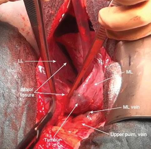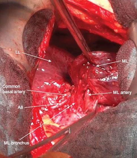However, as there are mostly more than one middle lobe arteries, complete visualization of all arterial branches is recommended. Therefore, the middle lobe is now placed anteriorly exposing the major fissure.
