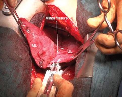 Figure 11.12 Placement of stapler to transect minor fissure.