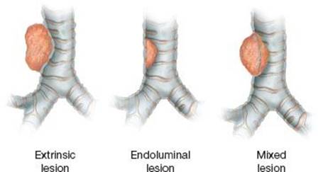 Figure 2.1 Lesions can cause tracheobronchial obstruction by extrinsic compression of the airway, endoluminal obstruction arising from the airway itself, or mixed lesions with both extrinsic and endoluminal obstruction.