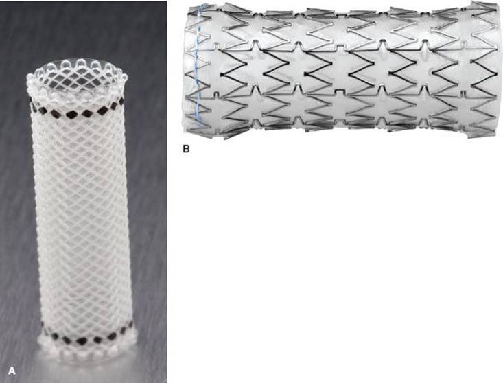 Figure 2.3 Expandable metal stents can be uncovered (A) or covered (B). Covered stents are easier to remove but tissue and tumor ingrowth can occur at the uncovered ends. (Images courtesy of Boston Scientific.)