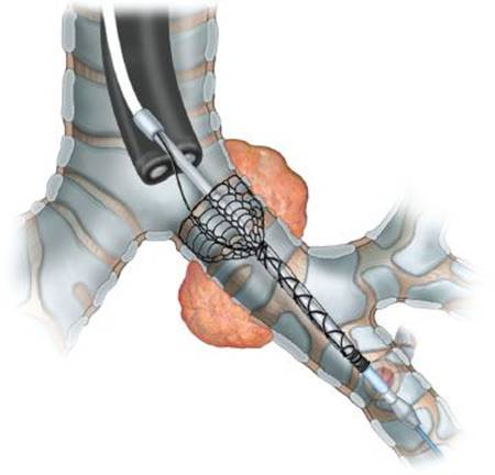 Figure 2.5 Self-expanding stents can be easily deployed over a guidewire using flexible bronchoscopy.