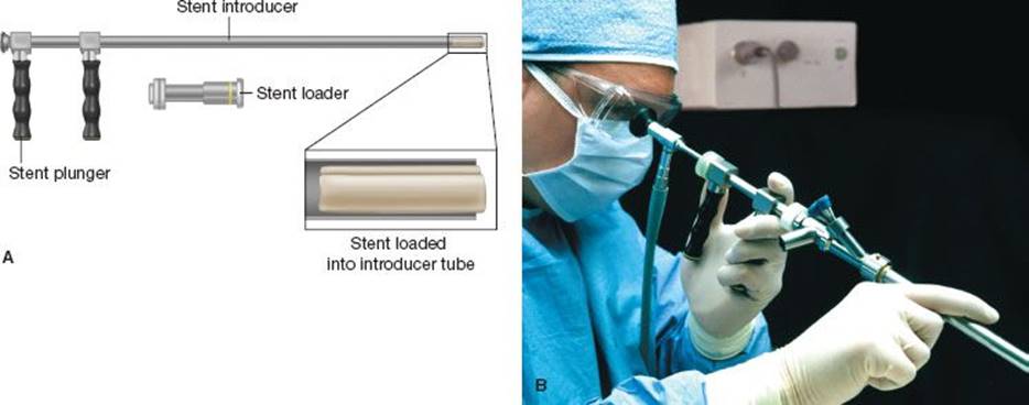 One described technique places the stent on the outside barrel of the rigid bronchoscope with an endotracheal tube inserted as a sheath over the proximal portion of the scope to serve as a “pusher tube” to keep the stent from displacing proximally on the barrel of the scope during insertion. The entire apparatus—rigid bronchoscope, endotracheal tube, and stent—is inserted. Once the tip of the bronchoscope is inserted beyond the stenosis, the bronchoscope is gradually rotated and withdrawn while the endotracheal tube “pusher” remains fixed in place and pushes the stent into the right location. Grasping forceps are used to adjust the stent’s final desired position. Problems with this technique are associated with the bulk of the entire apparatus; scope, tube, and stent must be carefully inserted past the vocal cords and through the stenotic area.