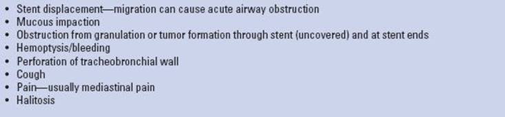 Well-positioned stents are remarkably well tolerated; however, specific complications associated with airway stents are related to the location and type of stent deployed and the individual’s tolerance to have foreign body prosthesis in the airway. Table 2.2 lists the common stent-related complications. The most common complications associated with airway stents are those that cause airway obstruction, including stent displacement, dried secretions within the stent, and granuloma tissue formation or tumor ingrowth causing reobstructive symptoms. As already mentioned, airway stents that are occluded by impacted mucous secretions can usually be cleared by rinsing and aspirating through a flexible bronchoscope. However, sometimes rigid bronchoscopy is required to remove silicone stents to clean it out and then subsequently be replaced. Likewise, stent migration or displacement usually requires rigid bronchoscopy for repositioning and granuloma or tumor growth causing stent obstruction can be mechanically debrided by rigid bronchoscopy or by a variety of ablative energy sources guided by bronchoscopy.