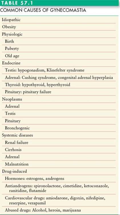 The most common cause of gynecomastia is unknown (idiopathic). The other common causes of gynecomastia are listed in Table 57.1. Gynecomastia often appears transiently at birth. The process is thought to be related to an increased level of circulating maternal estrogens. After birth, the estrogen level decreases, the gynecomastia resolves, and treatment is rarely necessary.