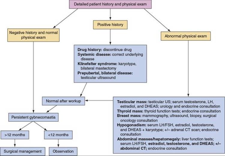 FIGURE 57.1. Algorithm for evaluation and treatment of gynecomastia. US, ultrasound; LH, luteinizing hormone; DHEAS, dihydroepiandrosterone sulfate; FSH, follicle-stimulating hormone; CT, computed tomography. Adapted from Rohrich RJ, Ha RY, Kenkel JM, Adams WP. Classification and management of gynecomastia: defining the role of ultrasound-assisted liposuction. Plastic Reconstr Surg. 2003;111:909.