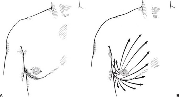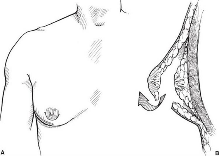 Most fibrous or solid Simon stage 1 or 2a lesions are treated with surgical excision or more recently, in selected cases, with ultrasonic liposuction. If surgical excision is chosen, a periareolar incision is performed as indicated in Figure 57.2A. The skin incision is placed at the junction of the areola and skin. If placed within the pigmented area, the scar may appear as a white line. If placed outside the areola, it may become hypertrophic. The site of the incision should be marked prior to the distortion caused by injection of epinephrine-containing solution. If placed properly, the ultimate scar is usually nearly invisible. After the incision is made, a cuff of tissue 1 to 1.5 cm in thickness is preserved directly deep to the nipple/areola complex. This maneuver prevents postoperative nipple/areola depression or adherence of the nipple/areola to the chest wall (Figure 57.2B). It is always better to leave more tissue under the nipple–areola than less. At the end of the case any excess is trimmed. The chest skin flaps are developed in a plane between the subcutaneous fat and the breast tissue. To assure a smooth contour, the edges of the breast are trimmed with either scissors or liposuction.
