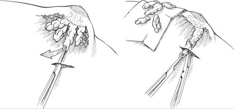 When liposuction is unsuccessful at removing all of the tissue required to achieve a good result, the pull-through13,14 technique is added. In this technique, either the lateral or periareolar incision is opened slightly (about 1.5 cm) and the residual tissue is grasped. The tissue is pulled out through the wound and removed with scissors or electrocautery. The pull-through resection is performed until the desired contour is achieved. Again, over-resection of the subareolar area is assiduously avoided (Figure 57.5). Drains are placed if the dead space is large. All patients are treated with compression garments for at least 1 month.
