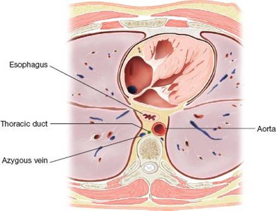 Figure 24.1 The thoracic duct usually lies in the posterior mediastinum, between the azygous vein, aorta, and esophagus.
