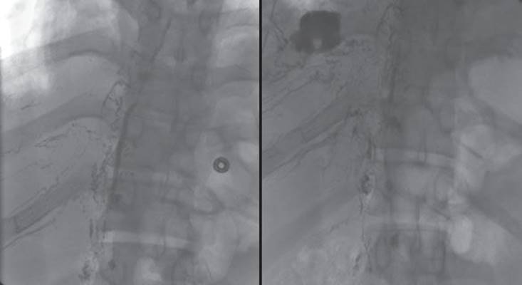 Lymphangiography is a difficult study to perform and its application is limited by local expertise. However, if available, this study can be a useful adjunct to preoperative planning. Lymphangiography can clarify the anatomy of the thoracic duct and potentially identify duplicate or aberrant anatomy. The study may also identify the leak (Fig. 24.2). If the expertise is available, an attempt at embolization of the thoracic duct is reasonable. Lymphangiography is most useful in complicated chyle leaks where the etiology or source of the leak is unclear or in situations where mass ligation fails to control the leak.