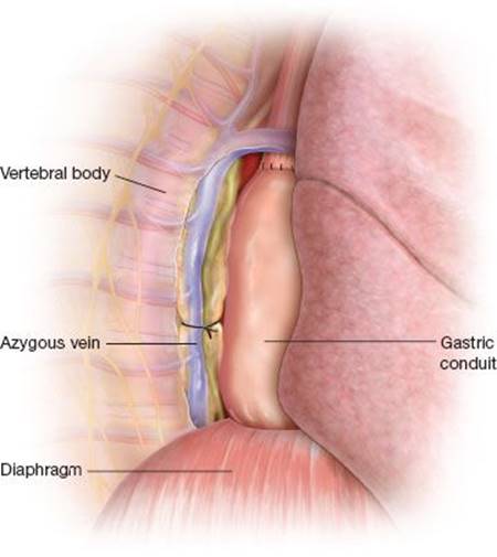 The drainage tube for the gastric conduit (retrograde gastrostomy or nasogastric tube) should remain to intermittent suction to drain the conduit and reduce the risk of aspiration with induction of anesthesia.