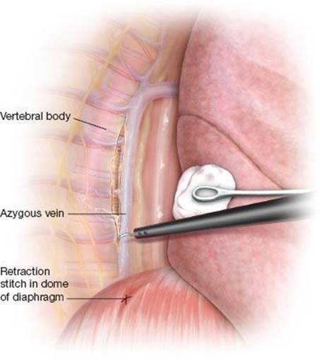 Figure 24.4 A retraction stitch placed in the dome of the diaphragm aids in exposure of the posterior mediastinal during thoracoscopic thoracic duct ligation. The mediastinal pleura is incised with electrocautery lateral to the azygous vein.
