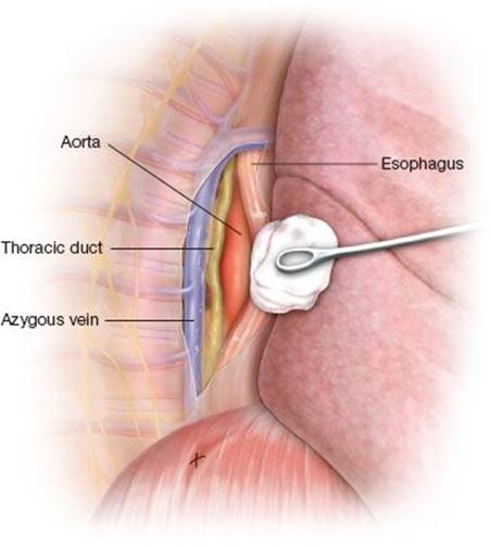 Figure 24.5 Dissection between the azygous vein and esophagus reveals the thoracic duct overlying the aorta during thoracoscopic duct ligation.