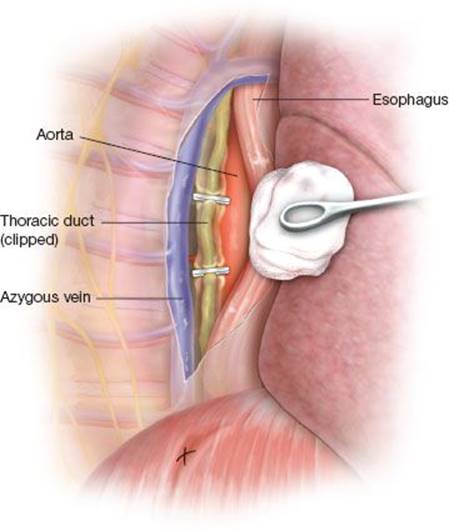 A figure-of-eight heavy polypropylene suture is placed in the dome of the diaphragm and brought through a chest tube incision to retract the diaphragm. The visceral pleura overlying the vertebral body adjacent to the aortic hiatus is incised with electrocautery. A large right-angle dissector is then used to elevate all of the soft tissue between the vertebral column and the medial aspect of the aorta. This tissue is then doubly ligated with heavy silk sutures (Fig. 24.3). Mass ligation of the duct as low as possible is important to control leaks that are not identified visually at the time of surgery. After ligation, some surgeons advocate mechanical pleurodesis as an adjunct. This is followed by placement of chest tubes to widely drain the hemithorax. The chest is closed in the standard fashion.