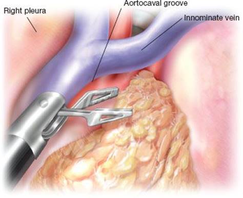 Figure 26.5 Dissection of the thymic tissue portion inside the aorto-caval groove, where sometimes a prominent right main thymic lobe may be found.