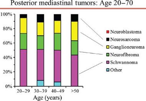 Figure 29.1 Proportion of posterior mediastinal tumor types by decades of age in adults. Legend: N/GN’blastoma, neuroblastoma/ganglioneuroblastoma; PNET, primitive neuroectodermal tumor. Reproduced with permission from Detterbeck: Mediastinal Tumors.32