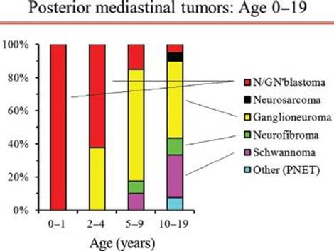 Figure 29.2 Proportion of posterior mediastinal tumor types by age in children and adolescents. Legend: N/GN’blastoma, neuroblastoma/ganglioneuroblastoma; PNET, primitive neuroectodermal tumor. Reproduced with permission from Detterbeck: Mediastinal Tumors.32