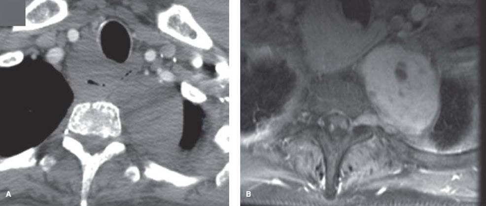 MRI is an accurate test to assess for a dumbbell tumor.21 Because CT may miss an intraspinal component,20 MRI is indicated whenever the tumor is contiguous with a neural foramen, there is a widened intervertebral foramen or erosion of a vertebral body or pedicle (Fig. 29.4A,B).21 MRI is more sensitive than traditional myelography.20 In addition, magnetic resonance angiography (MRA) can be useful in lower posterior mediastinal tumors to locate the artery of Adamkiewicz instead of arteriography, which has a 2% complication rate.20