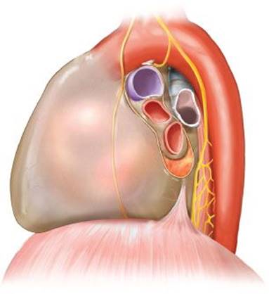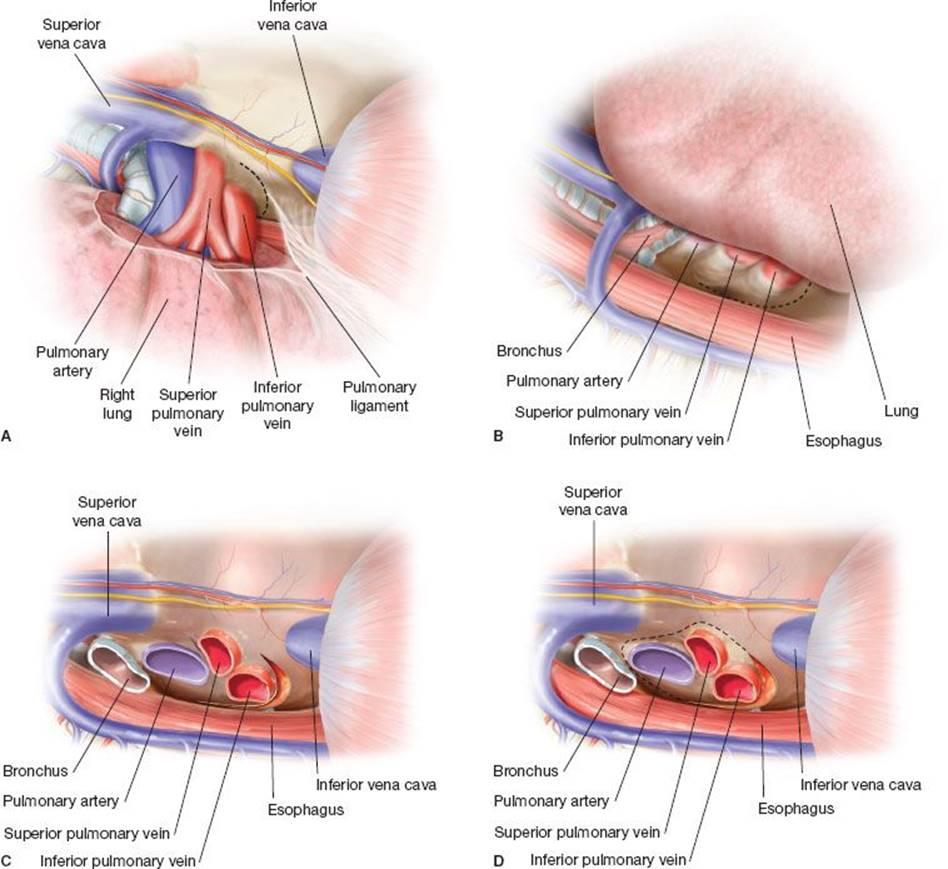After identifying and preserving the phrenic nerve, the inferior pulmonary ligament is divided to give access to the pericardium over the inferior pulmonary vein. A U-shaped incision in the pericardium is then performed anterior, inferior, and posterior to the inferior pulmonary vein. The phrenic nerve lies anterior to the plane of the pericardial incision. The intrapericardial longitudinal raphe between the inferior pulmonary vein and inferior vena cava attaching the pericardium to the epicardium is freed above to the entry of the inferior pulmonary vein into the atrium. To gain even more hilar mobility, an extension of the pericardial incision posteriorly and anteriorly directed superiorly above the pulmonary artery is performed rendering the pericardium completely incised around the hilum.