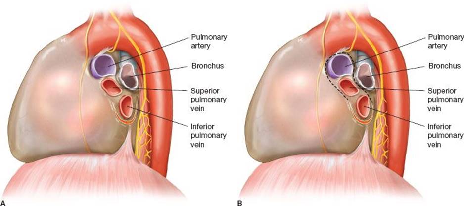 Right pericardial release (Fig. 32.1) can add 1 to 2 cm to right hilar mobility to secure a tension-free anastomosis. Care must be taken not to injure the phrenic nerve anterior to the pulmonary vessels. Preservation of mediastinal tissue around the hilum especially posterior to the pericardium and inferior to the main bronchus will aid the preservation of bronchial blood supply and posterior pulmonary lymphatics. Closure of pericardium is not necessary after pericardial hilar release.