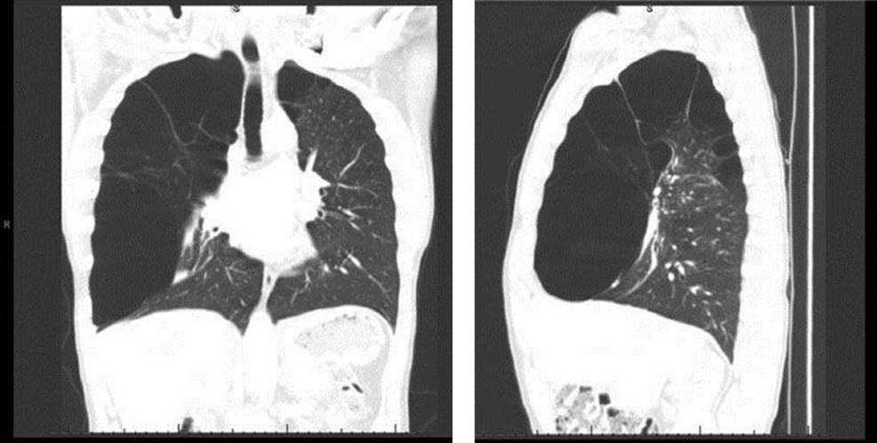 Figure 8.1 Sagittal and coronal computed tomography images of the chest demonstrating a giant bulla compressing the right lower lobe and flattening the diaphragm.