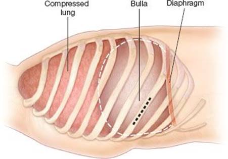Bullous emphysema is characterized by cystic degeneration of the lung parenchyma. The distribution of bullous emphysema can be focal or diffuse. These cystic airspaces can expand to occupy a significant portion of the pleural cavity and, in the case of focal disease, restrict ventilation of adjacent functional lung tissue. Giant bullae occupy greater than 30% of the chest cavity and can cause significant dyspnea and hypoxia due to compression of functional adjacent lung, air trapping, loss of airway elastic recoil, and impaired diaphragmatic function. It has long been recognized that resection or decompression of giant bulla can improve respiratory mechanics and symptoms in selected patients with giant bullous emphysema.