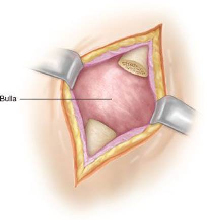 1. A small incision is made directly over the most dependent portion of the bulla as determined by preoperative imaging or with assistance of thoracoscopy (Fig. 8.2).