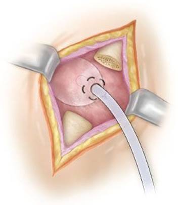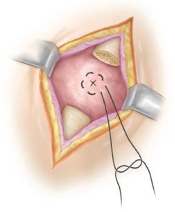 Figure 8.4 Placement of the purse-string suture and incision of the bulla.