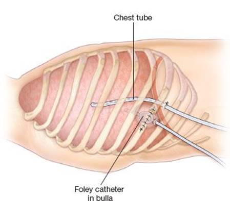 Bullectomy, performed by thoracoscopy, thoracotomy or sternotomy, is an accepted method of management in patients with significant symptoms. Some patients with giant bullae have limited pulmonary reserve and will not tolerate either single lung ventilation required for thoracoscopy or the pulmonary compromise associated with a transthoracic resection. Furthermore, bullectomy often sacrifices some functional lung tissue and, despite buttressed staple lines, can be complicated by prolonged air leak. In certain situations, drainage of the bulla can achieve similar improvements in respiratory mechanics without the disadvantages of bullectomy.