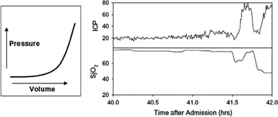 Figure 146.1. The left graph illustrates the nonlinear nature of the relationship between the volume of intracranial contents and intracranial pressure. The right graph shows the actual intracranial pressure (ICP) and jugular venous oxygen saturation (SjO2) tracings in a patient who developed a delayed intracranial hematoma. Initially the rise in ICP was minimal as the brain was able to compensate for the increasing volume from the hematoma. Later when these compensatory mechanisms were exhausted, there was a very rapid increase in ICP associated with compromise of cerebral blood flow and a decrease in SjO2. |