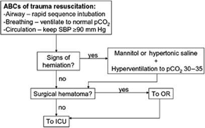 Figure 146.3. Algorithm for initial management of patient with elevated intracranial pressure. ICU, intensive care unit; OR, operating room; SBP, systolic blood pressure. |