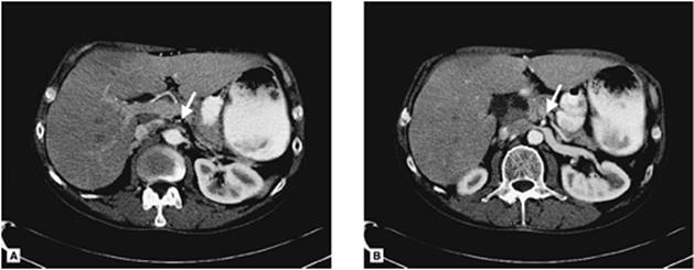 Figure 159.2. Two CT arteriograms are shown in a patient with chronic mesenteric ischemia (CMI) and an occluded celiac axis and superior mesenteric artery. A: The origin of the superior mesenteric artery is shown with the arrow. There is no contrast within the lumen of the vessel at this cross section. B: The superior mesenteric artery is shown with the arrow in this cross section that is 10 mm caudal to the first image. The artery is patent at this level as reflected by the contrast within the lumen. |