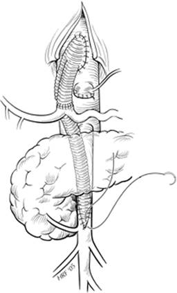 Figure 159.4. The completed antegrade bypass from the supraceliac aorta to both the celiac axis and the superior mesenteric artery is shown. (From Huber TS, Lee WA. Revascularization for chronic mesenteric ischemia. In: Zelenock GB, Huber TS, Messina LM, et al., eds. Mastery of Vascular and Endovascular Surgery. Philadelphia, PA: Lippincott Williams & Wilkins; 2006:301, with permission.) |