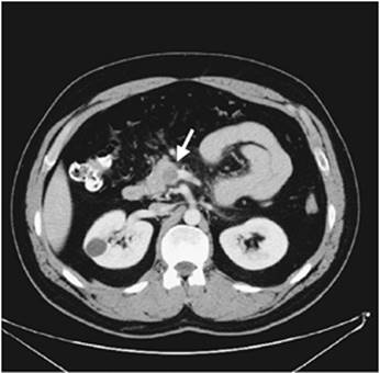 Figure 159.6. A CT scan of a patient with mesenteric venous thrombosis is shown. Note the thrombus in the superior mesenteric vein at its confluence with the splenic vein as shown with the arrow. |