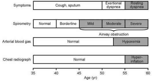 FIG. 1-1. Typical progression of the symptoms of chronic obstructive pulmonary disease (COPD). Only spirometry enables the detection of COPD years before shortness of breath develops. (From PL Enright, RE Hyatt [eds]: Office Spirometry: A Practical Guide to the Selection and Use of Spirometers. Philadelphia: Lea & Febiger, 1987. Used with permission of Mayo Foundation for Medical Education and Research.)